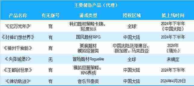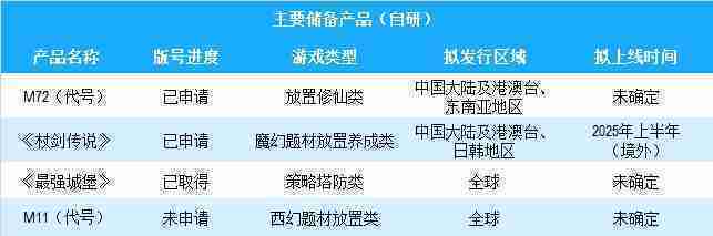 公司有多款儲備產品,,涵蓋放置類、、策略類、、RPG、、、、Roguelike等多元化游戲品類,,儲備的主要自研和代理產品如下::::